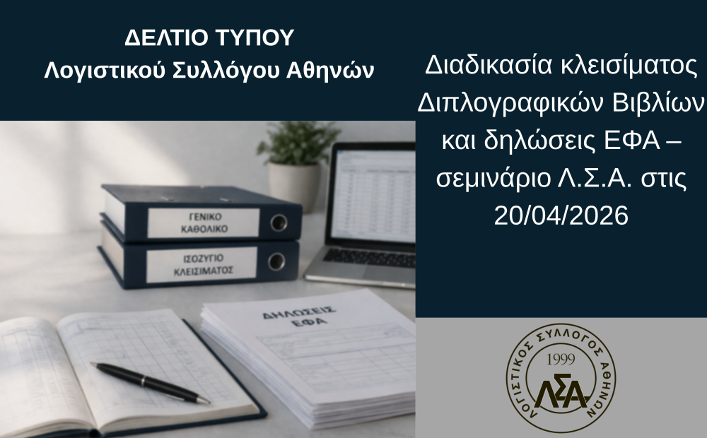 Δ.Τ.: Διαδικασία κλεισίματος Διπλογραφικών Βιβλίων και δηλώσεις ΕΦΑ – σεμινάριο Λ.Σ.Α. στις 20/04/2026